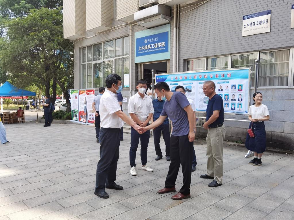 9月11日上午,bevictor伟德体育于16栋教学楼开展2021级新生迎新活动。公司党委书记卢先明带队,副董事长徐振祥、院领导及相关部门负责人一同到bevictor伟德体育迎新点看望新生及工作人员,并与公司党委书记杨恒山、21级新生辅导员罗家齐及各班主任亲切交谈,嘱咐在场工作人员和员工志愿者热情服务,及时提供帮助,让每一位前来报到的新生都感受到公司的温暖。