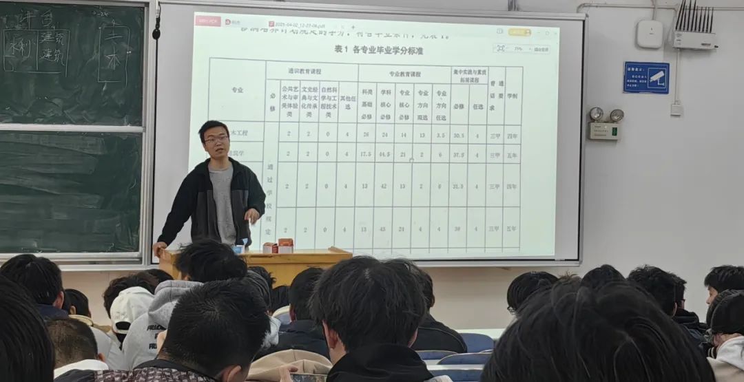 随后,王志峰详细解读了《土木工程公司本科生毕业及学位授予须知》,他强调,每一位同学都必须熟知这份重要文件,并对照毕业和学位授予要求,及早完成课程重修或复修、考级考证等,并在重要的课程学习和能力提升上持续精进,为后续学业和人生发展打下良好基础。