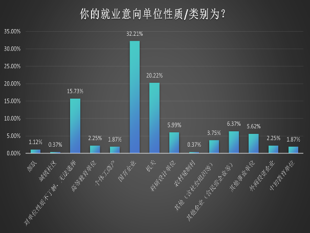 32.21%的毕业生们期待毕业之后进入国企工作,20.22%的毕业生期待毕业之后进入机关工作。