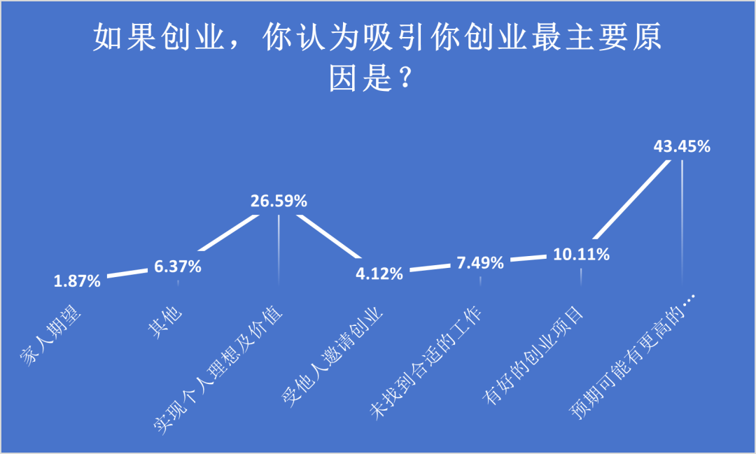 调查研究表明,如果选择创业,有43.45%的毕业生创业的原因是“预计有更高的收入”,同时也有26.59%的毕业生创业是为了“实现个人理想及价值”。