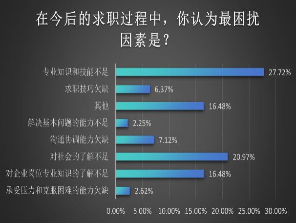 面对求职过程中存在的困扰,27.72%的毕业生认为“专业知识和技能不足”是最困扰的因素,其次是“对社会的了解不足”,占比20.97%。16.48%的毕业生认为“对企业岗位专业知识的了解不足”是求职中最困扰的因素。