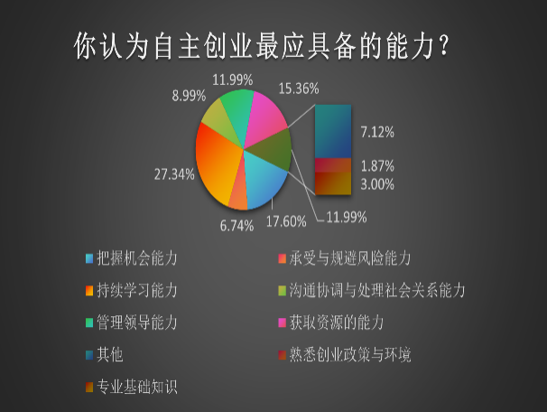 持续学习能力”、“把握机会能力”、“获取资源的能力”、“管理领导能力”、“沟通协调与处理社会关系能力”、“承受与规避风险能力”、“专业基础知识”、“熟悉创业政策与环境”等是创业应具备的能力之一。其中“持续学习能力”占比最高,为27.34%;其次为“把握机会能力”,占比17.60%;占比最少的是“熟悉创业政策与环境”,占比1.87%。