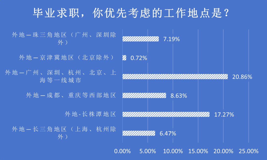 在工作地点选择上,20.86%的毕业生优先考虑的工作地点是北上广深等一线城市,17.27%的毕业生优先考虑长株潭地区的工作机会,只有0.72%的毕业生优先考虑的工作地点是京津冀地区(北京除外)。