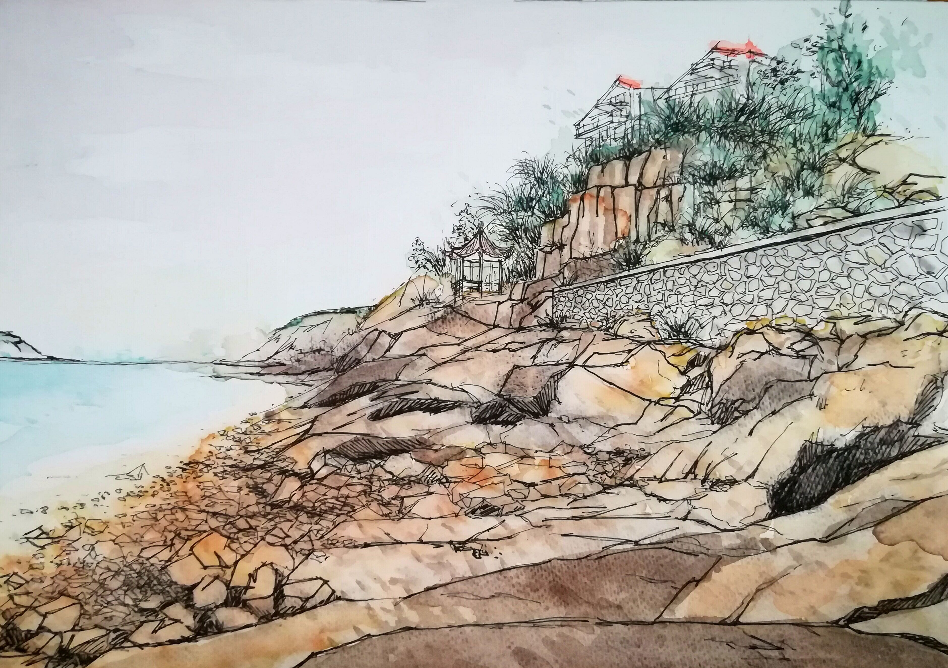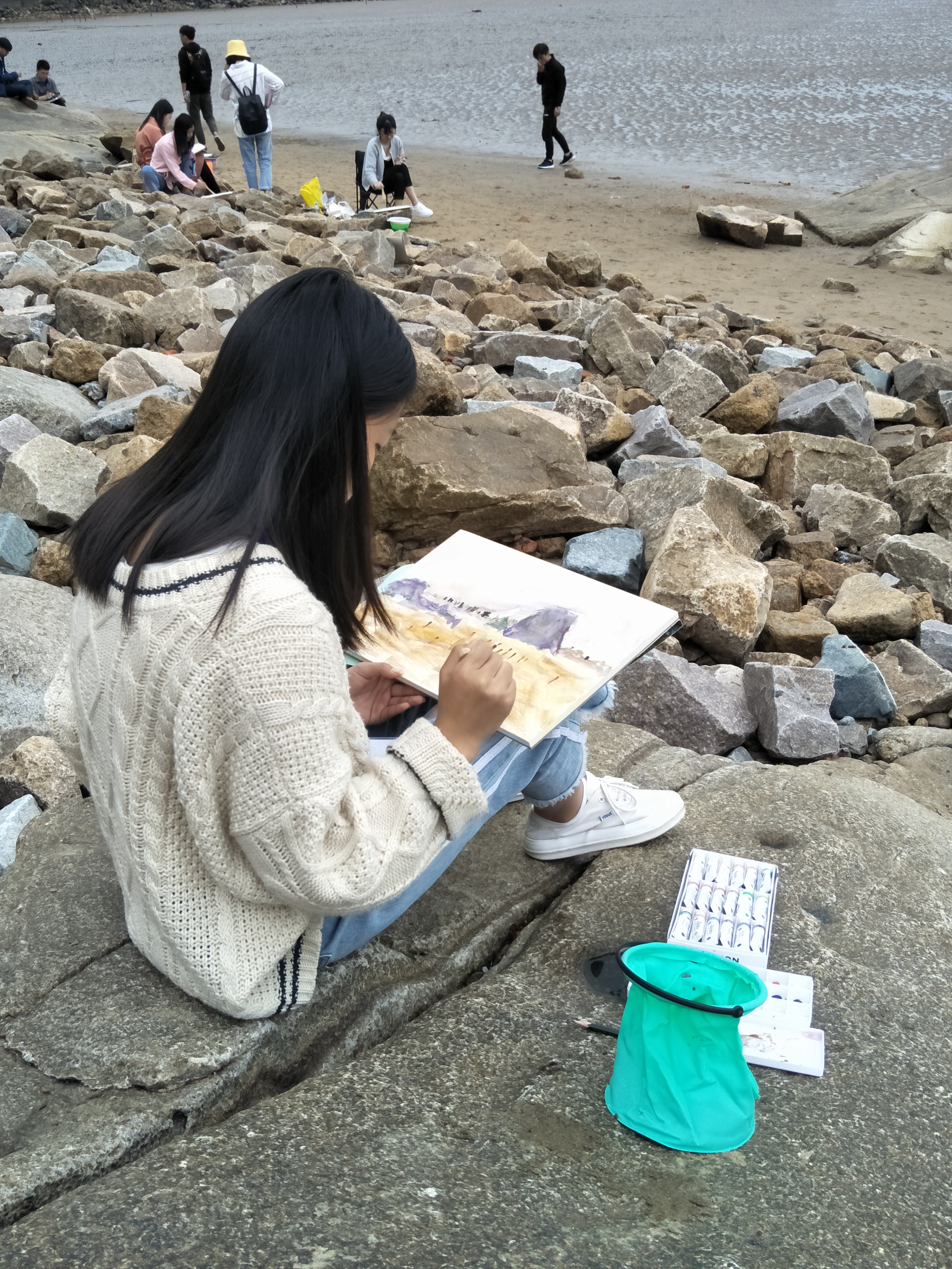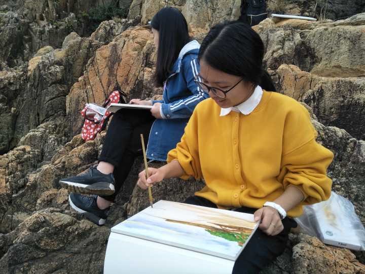 当晚,师生们抵达风景清丽、海天一色的琅岐岛。次日,晨曦微露,光影流转之间,浪拍礁石声里,同学们于琅岐岛龙鼓写生基地开始了为期五天的自由写生练习。他们以画笔勾勒轮廓,以色彩填补空白,将这一方天地定格于此:惊涛拍岸、苍鹭月影、日落云海等无不刻画出海边的旖旎风光。带队老师对同学们的画作进行点评指导,并作出示范。写生之余,另有篝火晚会等娱乐活动,大家在活动中相互交流,共同进步。