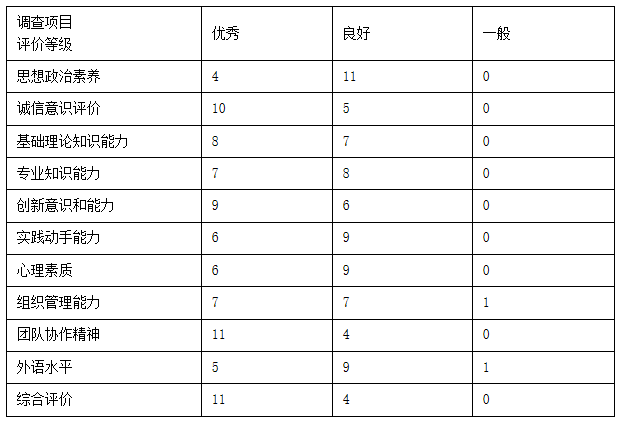 由上表可以看出用人单位对公司2020届毕业生在诚信意识、团队协作精神、综合评价方面的满意度较高,在组织管理能力、外语水平方面评价不足,在思想政治素养、实践动手能力、心理素质等方面认为有待提高。