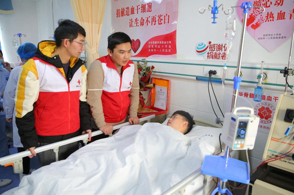 (1月18日上午,李扬(左一)和姚秀成为正在采集造血干细胞的龚海兵加油打气)