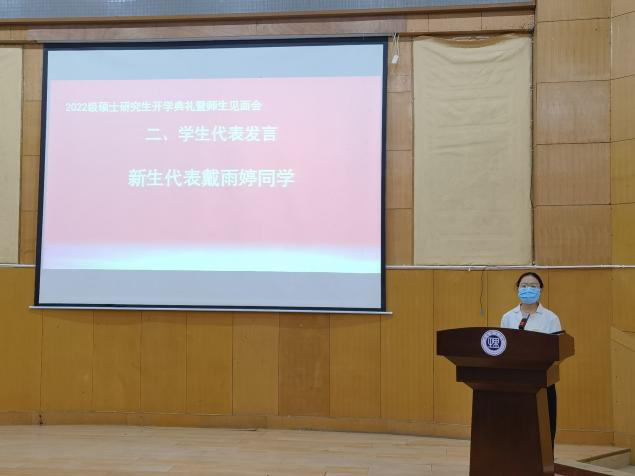 会议伊始,全体师生起立,奏唱国歌。22级研究生新生代表戴雨婷与21级研究生老生代表周永玲先后发言,在分享个人感悟和体会的同时,多角度叙述研究生应当注重自主学习与创新,积极探索、刻苦钻研,以实事求是的态度追求真理。